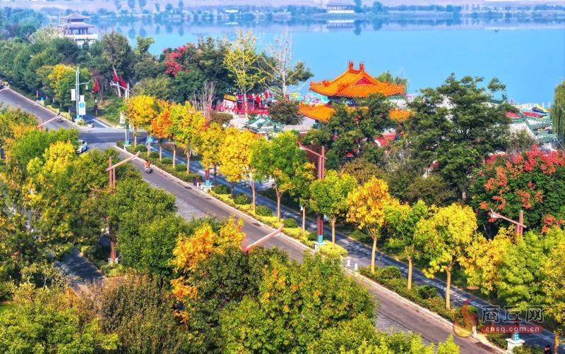10月15日,河南商丘古城东门外月老公园附近的行道树如同一幅美丽的画。时下,古城周边开启“变色”模式。城湖一池碧水与湖畔五彩的树叶交织在一起,点缀着古城湖畔的每个角落,色彩斑斓、诗情画意,游客仿佛置身于一幅美丽的画卷之中。