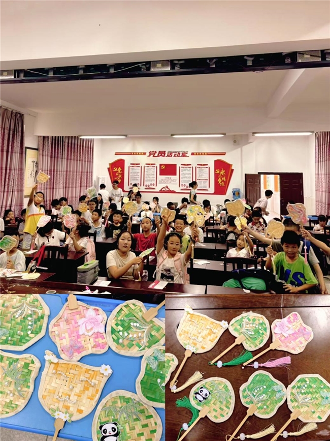 为助力乡村文化振兴,实践团将中江特色非物质文化遗产——集凤藤编竹扇工艺引入课堂。团队特邀当地资深藤编艺人刘师傅现场授课。在刘师傅指导下,学生从选材、劈篾开始,逐步学习编织、定型等步骤。四年级学生张欣怡展示其编织的首把简易竹扇时表示:“家乡拥有如此精湛的技艺!虽初次尝试不够规整,但希望未来能继续学习。”学生通过亲手实践,既锻炼了动手能力,也深刻感受到家乡传统文化的魅力,文化自信与传承责任感油然而生。