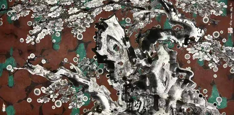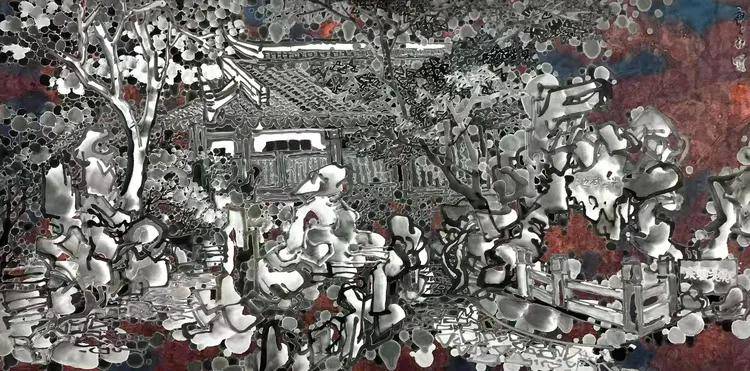《红梅阁》园林写生系列 69高x139cm 宽 水墨纸本设色 2023年作。俄罗斯国立工艺美术学院为艺术家颁发收藏证书