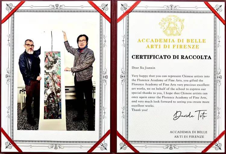《荷塘双鸟》水墨纸本设色 69cm x 138cm 2025年作 英国剑桥大学菲茨威廉博物馆为艺术家颁发收藏证书