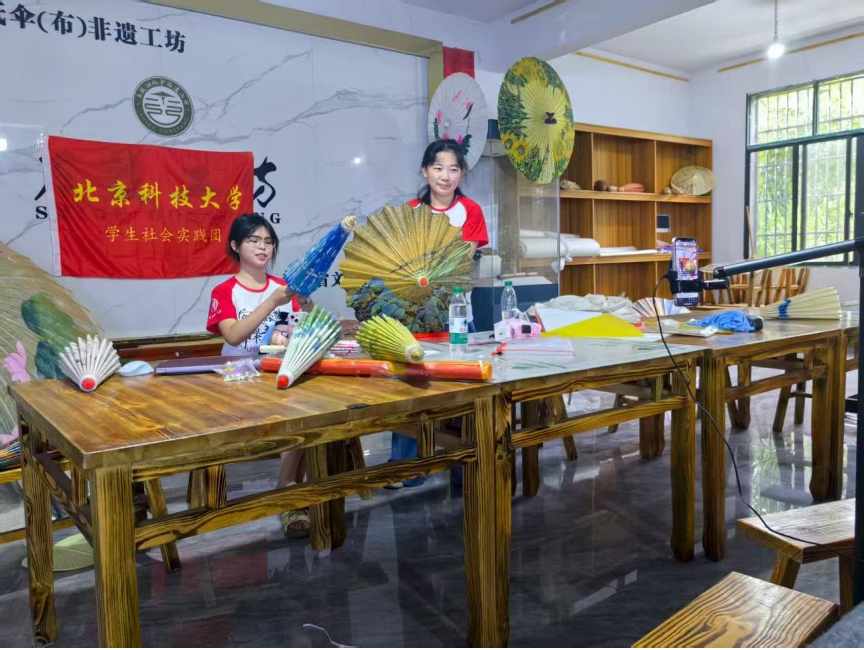 实践伊始,团队即在宇昌伞厂迅速启动电商直播计划。累计完成10场高质量直播,总时长超1500分钟,收获点赞逾10万次,成功线上销售优质油纸伞数十把,累计销售额突破千元,有效拓展了线上用户群体。同时,为扩大影响力,团队联合北京科技大学甘露甘霖、长青渝见、秦韵暖心等7支兄弟实践队,通过录制讲解视频、实物传递等创新形式,让承载深厚文化的石鼓油纸伞走进更广阔视野,特别是将非遗的种子播撒于广大青少年心中。
