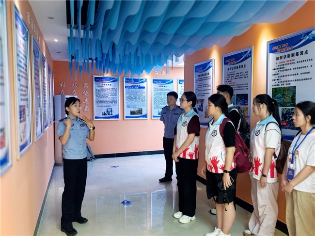 7月28日,实践团走进上栗县禁毒教育基地,在警官蔡妍玉的带领下开启沉浸式禁毒学习之旅。蔡警官讲解了上栗县禁毒历史脉络,从早期禁毒举措到如今全民参与的禁毒格局,让成员们深知禁毒工作的传承与坚守,明晰守护无毒净土的责任。在主展厅蔡警官重点讲解“毒品预防”板块,用漫画、案例拆穿毒贩诱骗青少年的幌子;“戒毒模式”展区介绍戒毒路径,说明戒毒需个人决心与社会帮扶;“吸毒危害”展区展现吸毒后果,凸显禁毒宣传迫切性;新型毒品仿真模型柜展示伪装毒品,蔡警官强调其隐蔽性,提醒大家远离诱惑。第二展厅里蔡警官追溯“毒品起源”,呈现“毒品分布”“毒品蔓延”情况,“吸毒案例”聚焦本地,让成员们深刻认识到毒品危害就在身边,防毒禁毒刻不容缓。参观尾声,实践团观看禁毒主题宣传片,影片中禁毒工作者的坚守、吸毒家庭的破碎画面,让成员们深受触动,凝聚起青春禁毒的信念。