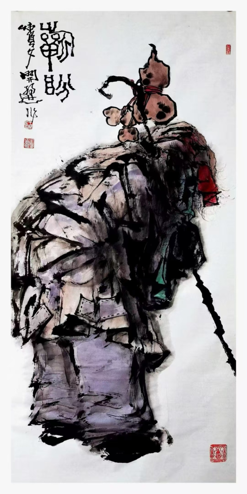 王开选自幼便与书画结下不解之缘,多年来笔耕不辍,对中国大写意画的研究更是达到了炉火纯青的境界。他的绘画风格,犹如“浩瀚流星豪情客,旷古奇才皇家识”所描述的那般豪放洒脱、独树一帜。在他的大写意人物画中,我们可以看到黄慎的笔姿放纵、气象雄伟,南宋梁楷的不拘法度、放浪形骸,以及八大山人的孤傲放任恣纵,但他又在此基础上融入了自己细腻的笔法,形成了独具特色的艺术语言。他笔下的人物,无论是“头陀”的憨态可掬,还是其他形象的生动传神,都能以简练的笔墨准确地抓取人物的本质特征,展现出人物的音容笑貌,将写意画推向了新的高度。他通过寥寥数笔,便能让人物意溢神定;大笔泼墨时,又能将情感表达得淋漓尽致,使观者仿佛能感受到画中人物的呼吸与情感。