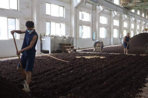 图为企业生产车间内,工人正手持工具对酒醅进行翻拌作业 罗缘欢供图