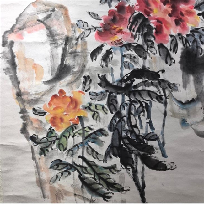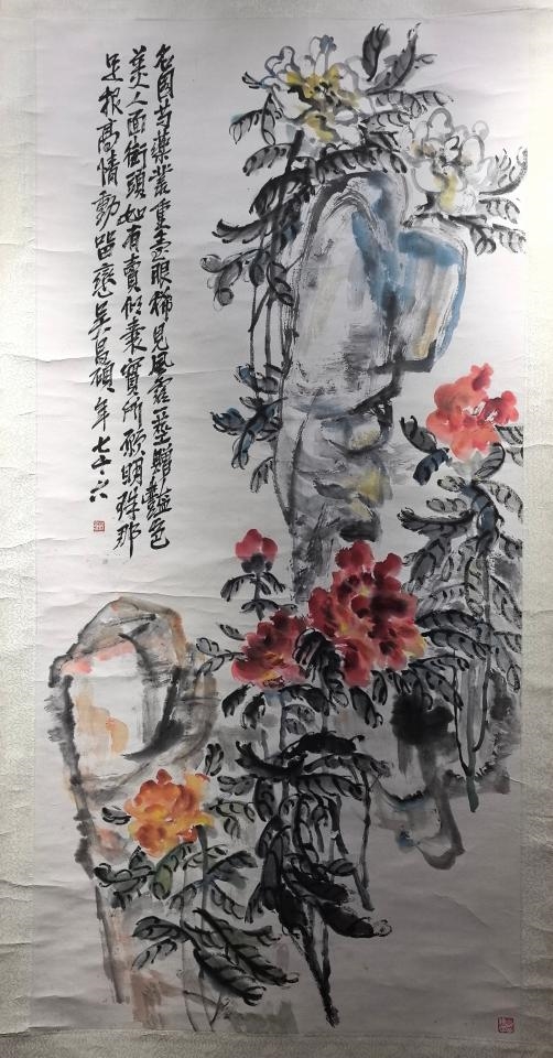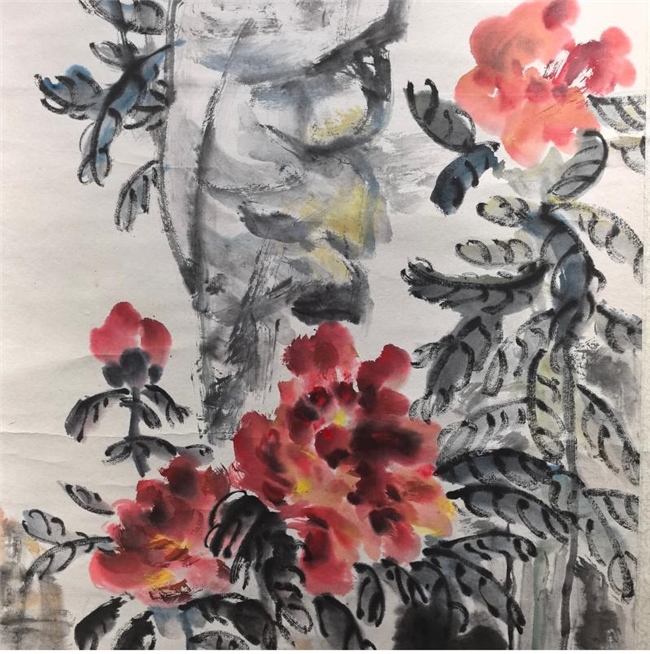 专家解读:整幅作品在构图上极为考究。画面饱满却毫无拥挤之感,疏密安排错落有致。画家通过巧妙布局,使芍药花、枝叶与山石相互映衬,形成了一种动态平衡。款识的书写同样彰显功力,笔力雄健,结体严谨,与画面的整体风格相得益彰。