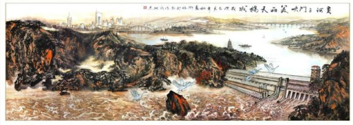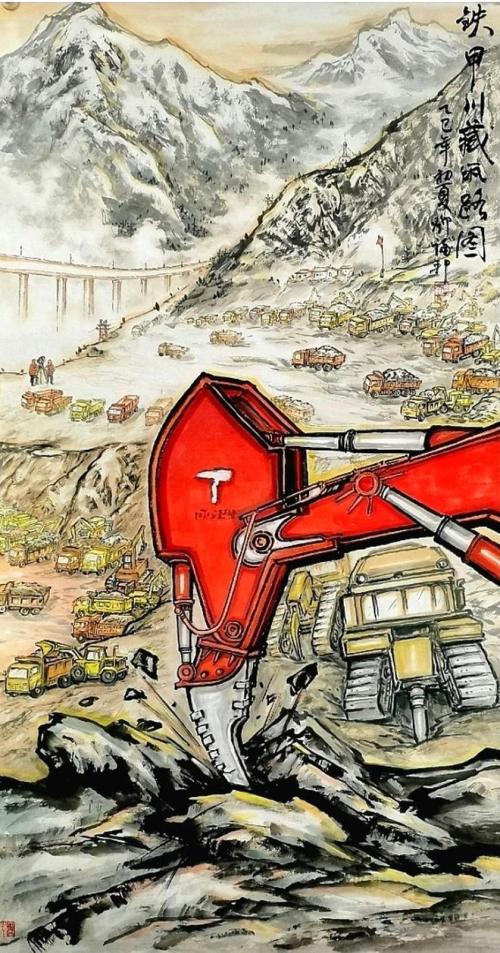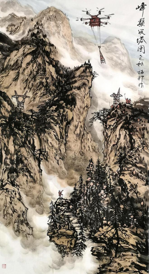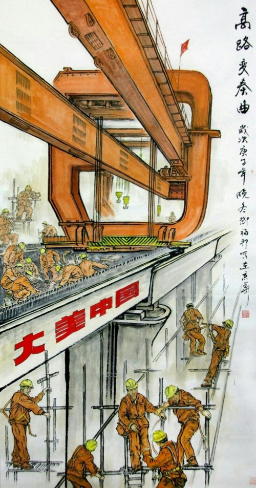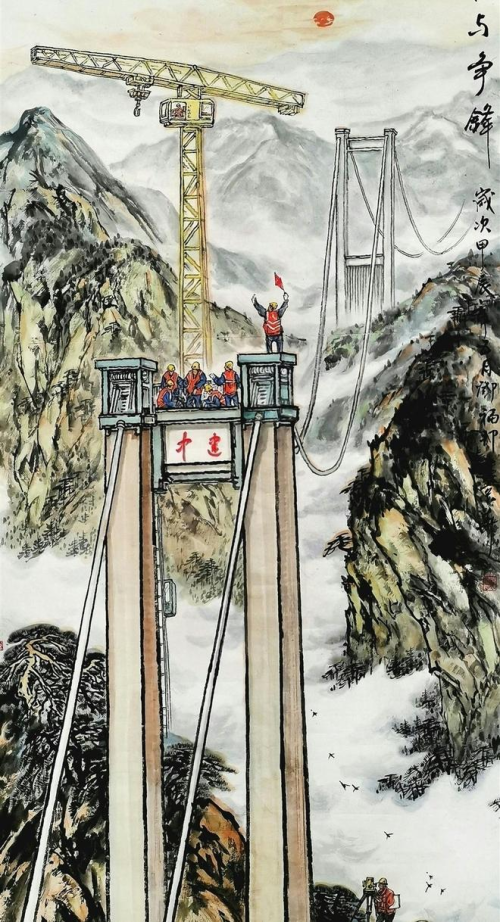 邓福邦艺术创作的突出特点在于他成功地将现代题材融入传统书画语言,创造出一种既熟悉又新颖的视觉体验。《谁与争锋》《高路变奏曲》等作品直接描绘当代桥梁建设场景,但运用的是传统水墨的表现手法。《谁与争锋》中,建筑工人高举红旗的瞬间被永恒定格在画面上,桥墩上的“中建”字样明确指向当代中国的建设成就,而云雾缭绕的山峦背景和传统题字又将这些现代元素自然地融入山水意境之中。