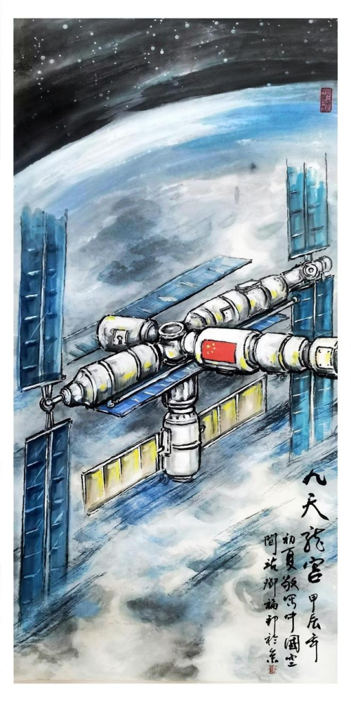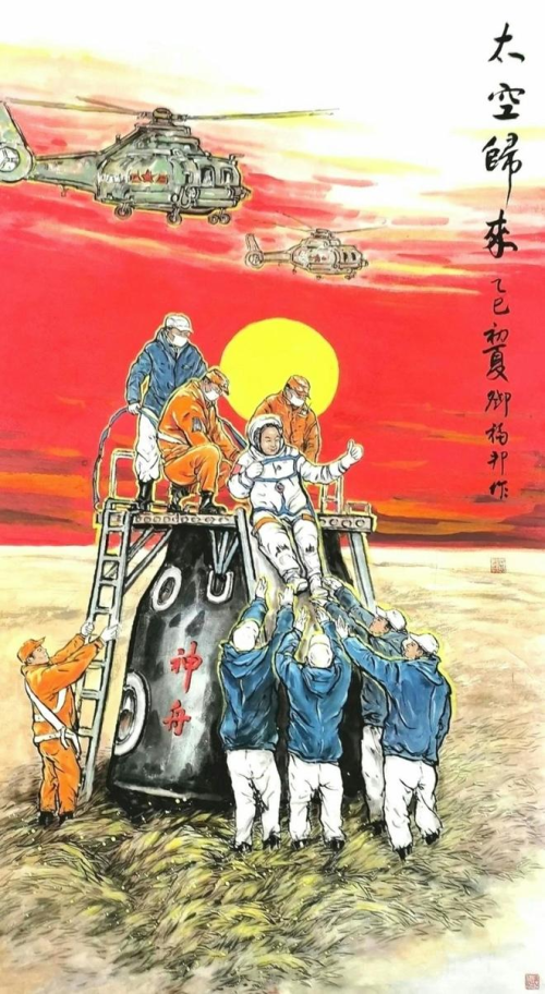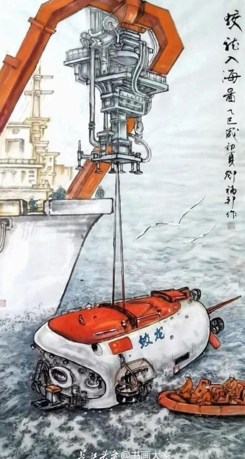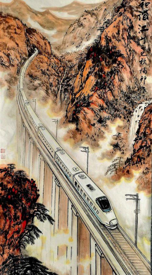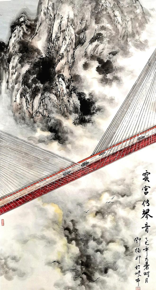 《云宫传琴音》和另一幅高铁题材作品则进一步展现了邓福邦对“现代山水”的探索。红色斜拉桥、白色高铁列车这些极具现代感的元素,在他的笔下与云雾山川和谐共存,传统水墨的渲染技法成功表现了现代工程的力与美。题字“云宫传琴音”极具诗意,将现代桥梁比作古琴,体现了画家将技术成就升华为艺术审美的能力。
