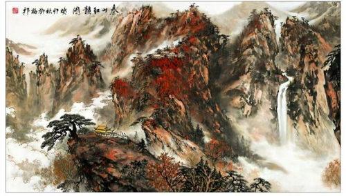 《秦山红韵图》以棕褐、墨色为主调,点缀鲜艳红色,营造出秋日的浓郁氛围。苍松、建筑、瀑布等元素的安排既符合传统山水画的构图法则,又通过色彩对比和光影处理赋予画面现代审美趣味。这种对传统山水语言的当代转化,正是邓福邦“道化丹青”理念的具体实践。