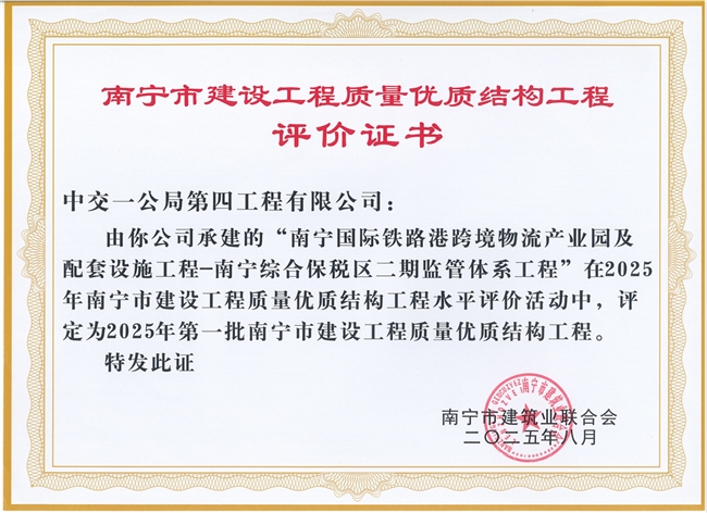 近日,由中交一公局第四工程有限公司南宁“两港一区”项目倾力打造的南宁综合保税区二期监管体系工程被评为“2025年第一批南宁市建设工程质量优质结构工程”。