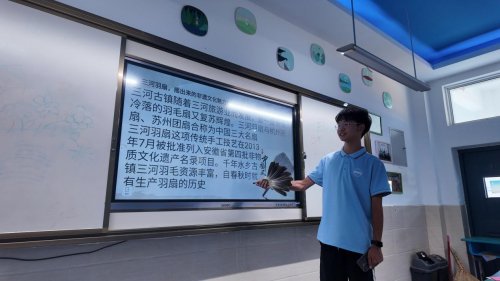 在三河羽扇的体验课上,孩子们跟随队员描绘扇面,从线条到色彩,学习羽扇背后的悠久工艺。羽扇轻摇,不仅带来清凉,更承载着三河古镇的文化记忆。