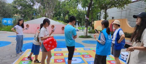 在教室外,另一部分实践队成员则在开展户外环节的布置工作。团队自制的巨型“大富翁”主题游戏垫铺满平整空地,两颗巨型充气骰子也准备就绪。中午时分,讲课结束后,学生们兴奋地走出教室,跃跃欲试地围在游戏垫前,等待活动开始。