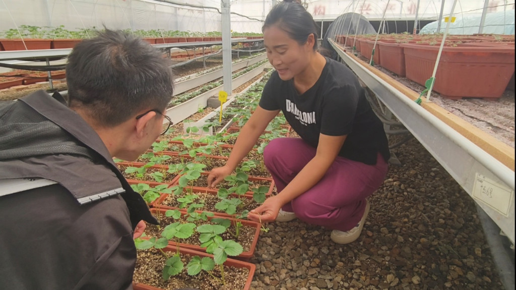 图1为实践队员参与扦插晚熟草莓 程歆然 摄