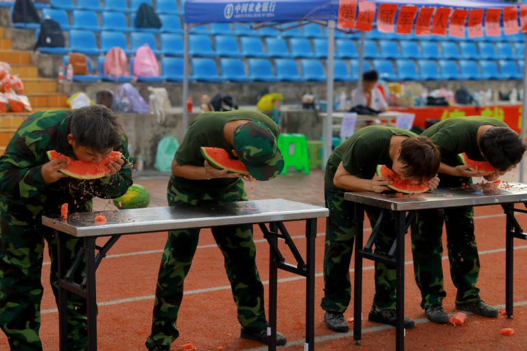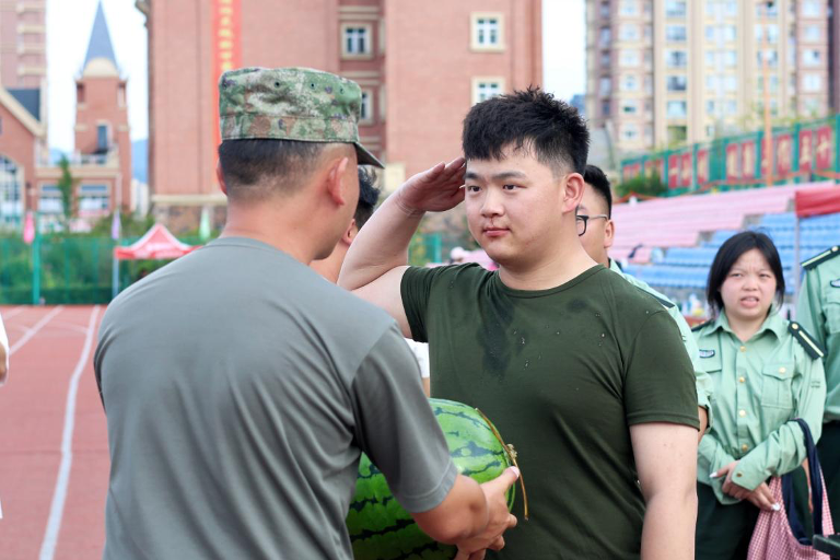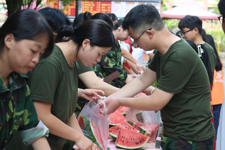 “吃了十八年的瓜,头回甜出电子榨菜的感觉!”一位新生边啃西瓜边笑着说道。现场,一袋袋切好的西瓜被迅速分发至各连队,翠绿的瓜皮、鲜红的瓜瓤,伴随着欢快的笑语,训练场瞬间变为大型“吃瓜”现场。