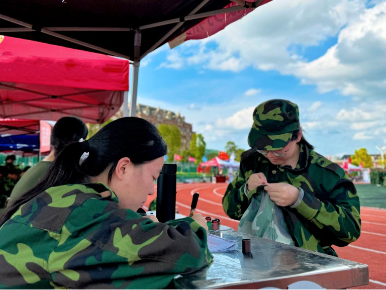 9月4日下午,夕阳斜照在贵州黔南科技学院的足球场上,军训口号声此起彼伏。就在一片迷彩阵列不远处的“勤务连”帐篷下,该校2025级网络与新媒体专业学生李楚月正小心地捻着浅绿色的缝衣线,低头专注地为一件撕裂的军训服缝合袖口。