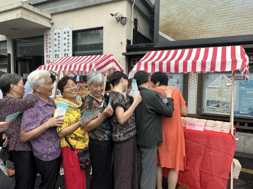 为检验学习效果,摊位特别设置“一对一快问快答”环节。“废旧电池属于哪类垃圾?”“易腐垃圾该如何正确投放?”面对提问,居民们积极抢答,答对者还能获得纸巾、指甲钳等实用小礼品。