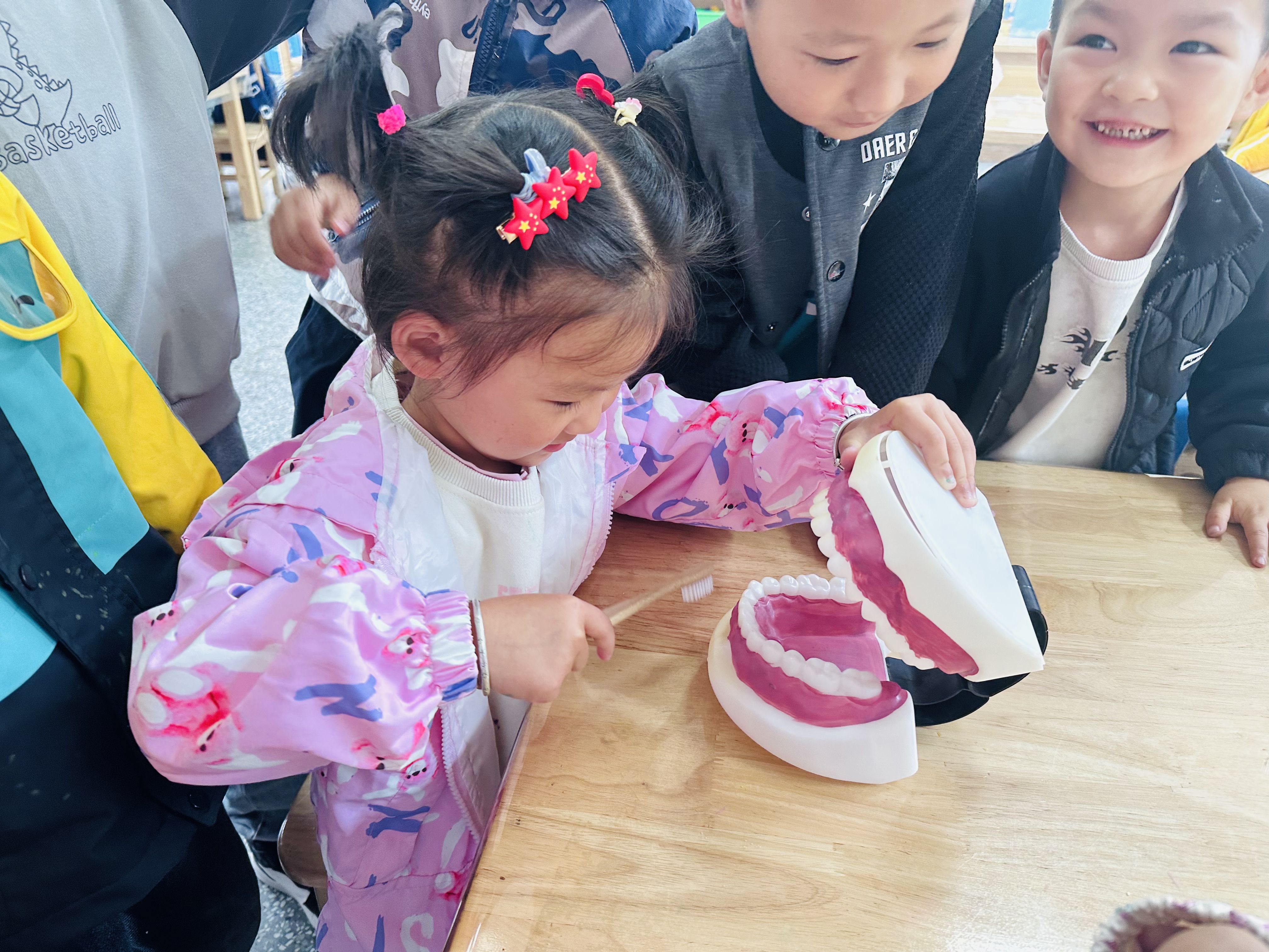 活动现场,幼儿班的小朋友们摇身一变,成为了“小小牙医”。有的孩子穿上白大褂、戴上医师帽,手持教具牙模和小牙刷,像模像样地给身边的小伙伴讲解牙齿的结构与作用;有的孩子围在桌前,通过超大牙模和牙刷,直观地学习正确的刷牙方法,在亲手实践中掌握护牙技能。