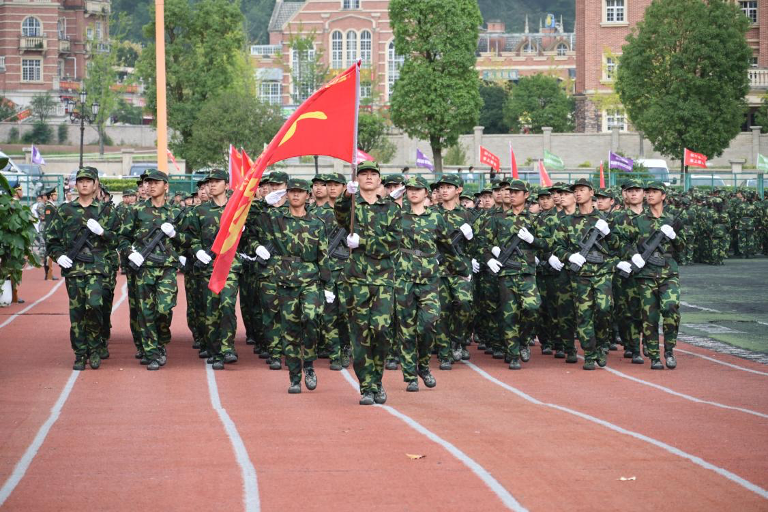 图为贵州黔南科技学院新生在进行分列式表演
