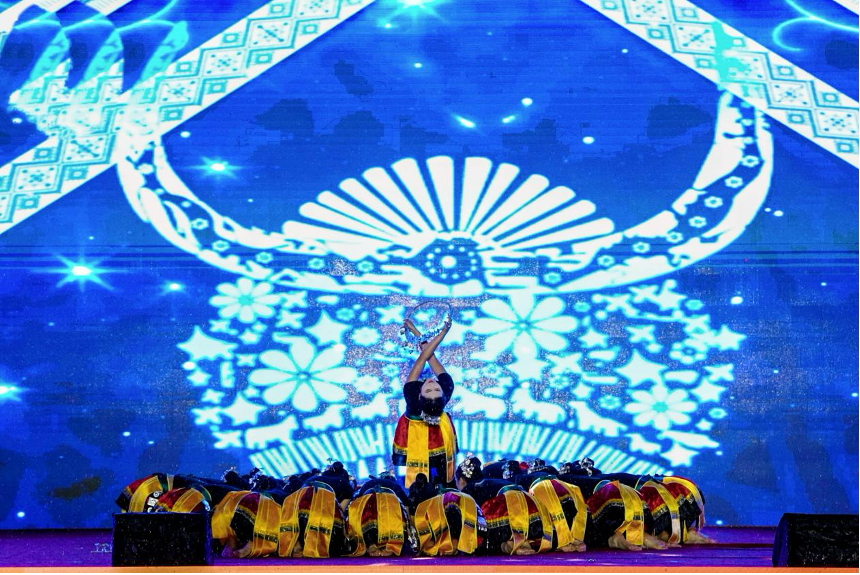 晚会在极具民族风情的苗族舞蹈《银项圈》中拉开帷幕,演员们身着银饰舞动雨幕,展现传统文化与现代青春的融合。