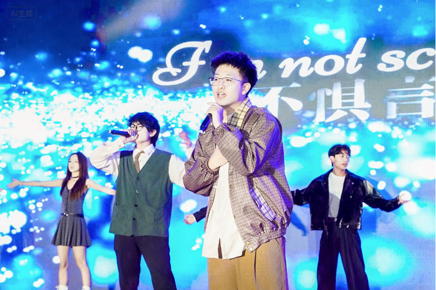 现场节目精彩纷呈,掌声与欢呼不断。情景剧《校园囧播》以幽默情节引发阵阵笑声;街舞串烧《玩转hip-hop》用酷炫舞步点燃全场;古典舞《踮步桥水悠悠》则以优美舞姿展现传统文化之美;尾声合唱《新声代 心征程》用嘹亮歌声传递出科院学子奋进新征程的坚定决心。尽管雨水不断,现场师生情绪高涨,荧光闪烁、雨衣成景,形成一道独特而温暖的校园夜景。