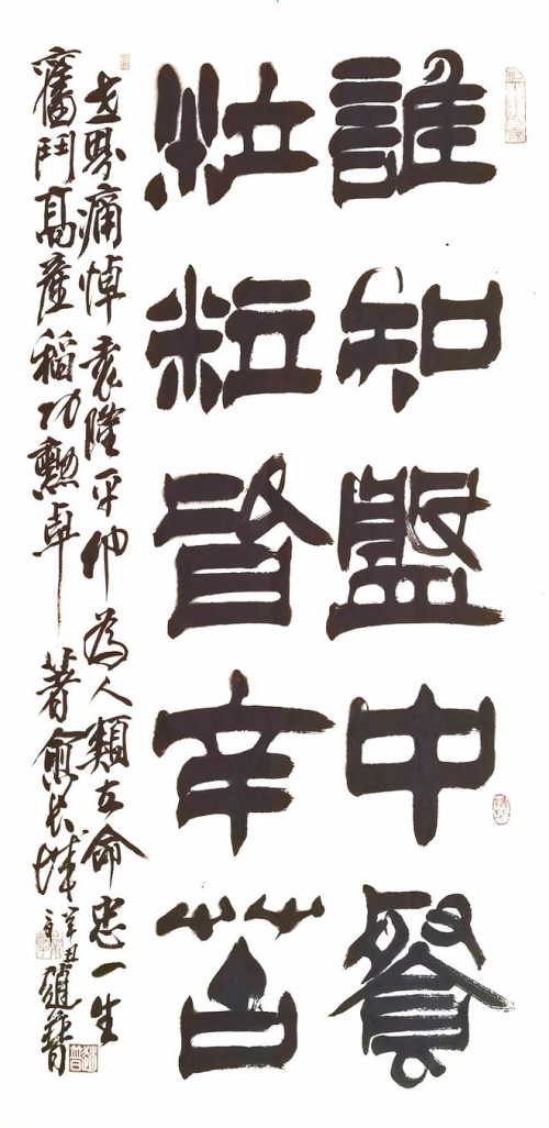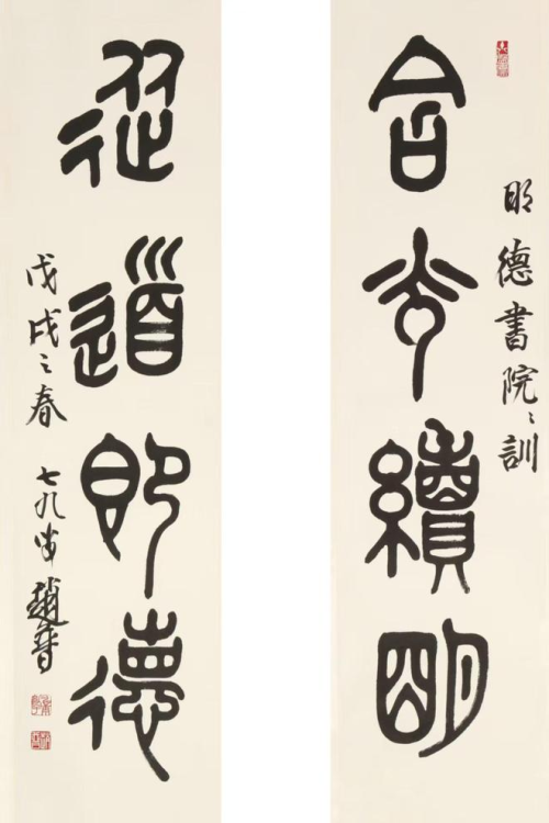 1999年,先生荣退,随即“闭关”地坛斋宫十余载,研习书法,成绩不断显成,终于写出了继古来新的独家面貌,即:中锋笃,方为主,减蚕雁,融篆行之“赵隶〞家风!